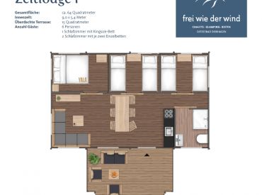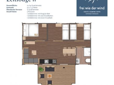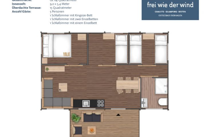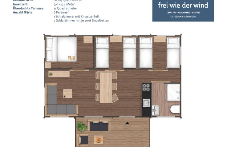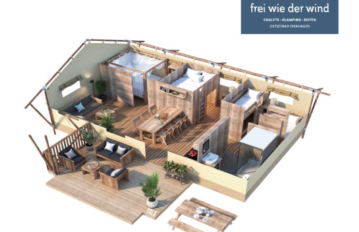 Die Zeltlodge II ist mit ihren 65 m² perfekt für Familien oder kleine Gruppen bis zu fünf Erwachsenen. Die flexible Raumaufteilung mit drei Schlafzimmern ermöglicht individuelle Schlafkonstellationen: ein Hauptschlafzimmer mit Kingsize-Bett, ein Zimmer mit zwei Einzelbetten und ein zusätzliches Zimmer mit einem Einzelbett. Auch hier genießt du eine großzügige 15 m² überdachte Terrasse als erweiterten Wohnraum im Freien, wo du die Ostseeluft in vollen Zügen genießen kannst.